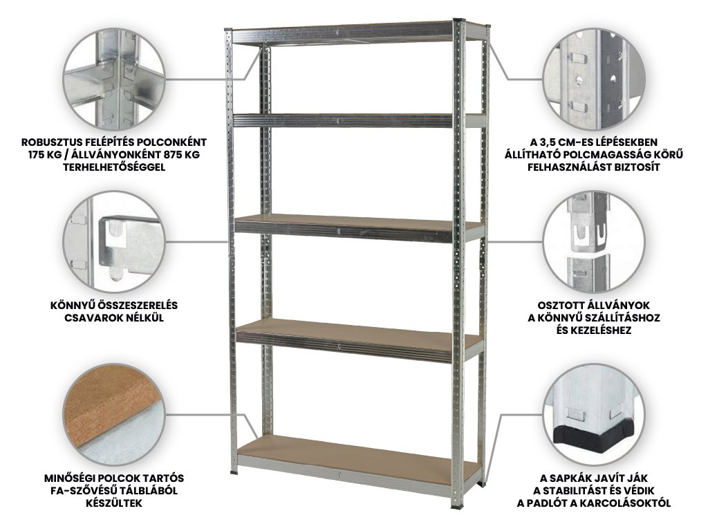 Kiváló minőségű és stabil Salgó polc öt állítható polccal költséghatékony megoldást jelent a tárgyai tárolására. Maximális terhelhetőség / polclaponként 175 kg, azaz 875 kg / állványonként. Salgó polcok hengerelt acélból készülnek, kiváló minőség jellemzi őket és 7 éves garancia. A Salgó polcot háztartásokban, irodákban, műhelyekben és garázsokban, valamint raktárakban vagy ipari helyiségekben lehet használni.