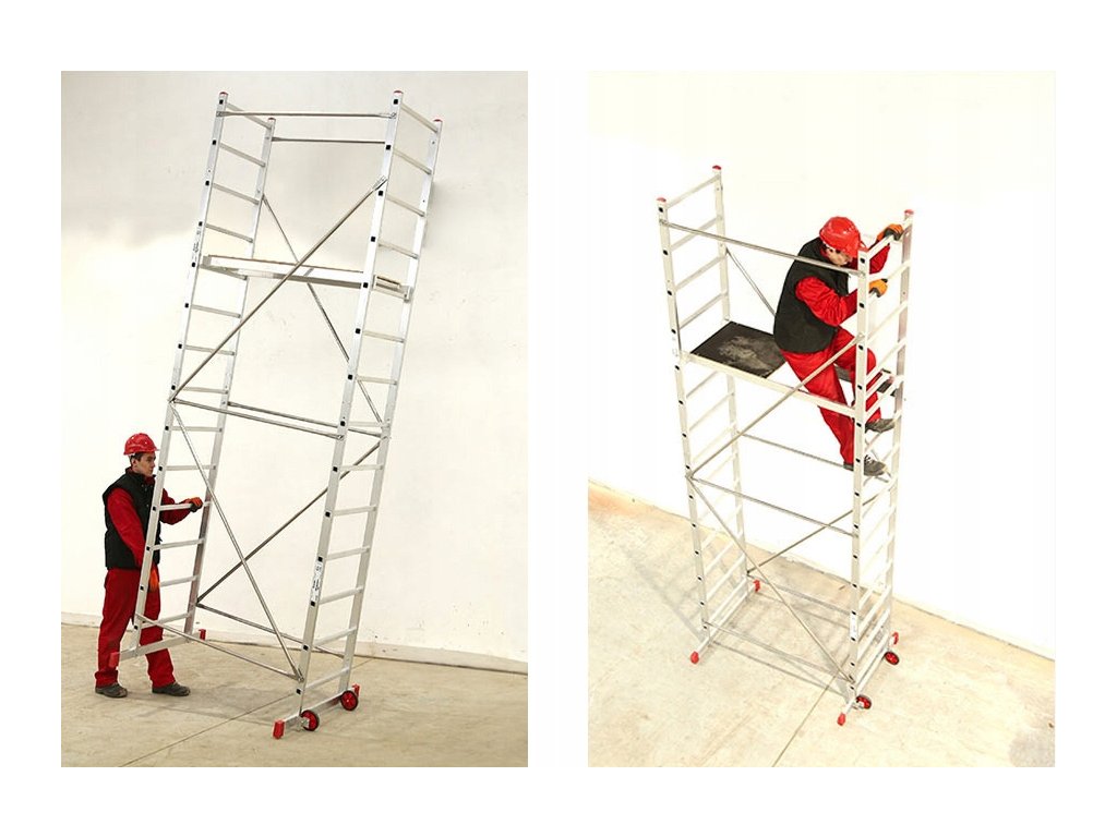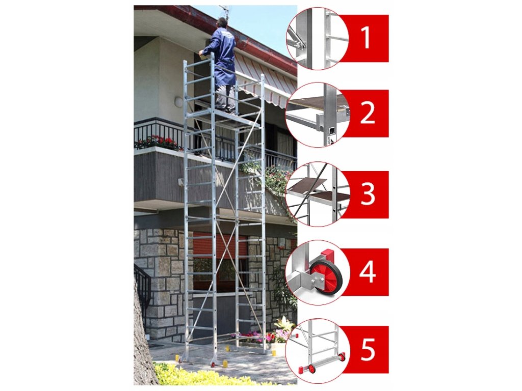 Stabil és minőségi állványzat, mely a mobilitásával és a könnyű kezelhetőségével tűnik ki. Ideális könnyebb beltéri vagy kültéri munkákhoz a háztartásban, a kertben, vagy építkezésen. Szerkezetét gyors, csavarmentes összeszereléshez és szétszereléshez tervezték. A könnyebb feljutás érdekében a dobogó nyitható fedéllel van felszerelve.