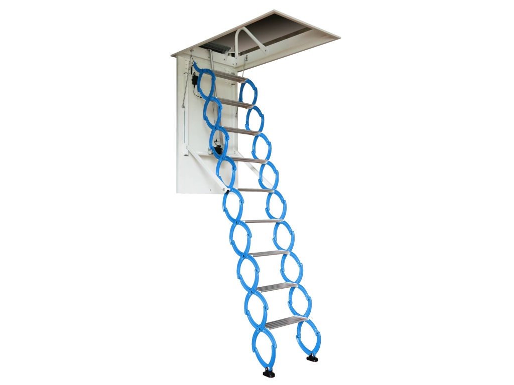 Praktikus kihúzható elektromos lépcső a felső szintre való feljutáshoz. A lépcsőt nem kell közvetlenül a padlástérhez használni, hanem a garázs, a tetőtérbővítés vagy a műhely következő emeletére való feljutáshoz is használható. A távirányítóval a lépcső nagyon könnyen kezelhető. Az elektromos motor segítségével a lépcső pillanatok alatt kibontakozik, és már használhatja is. Visszacsukása eredeti állapotába hasonlóan gyors. A lépcső a mennyezeti keretben rejtőzik, és nem akadályozza a teret.