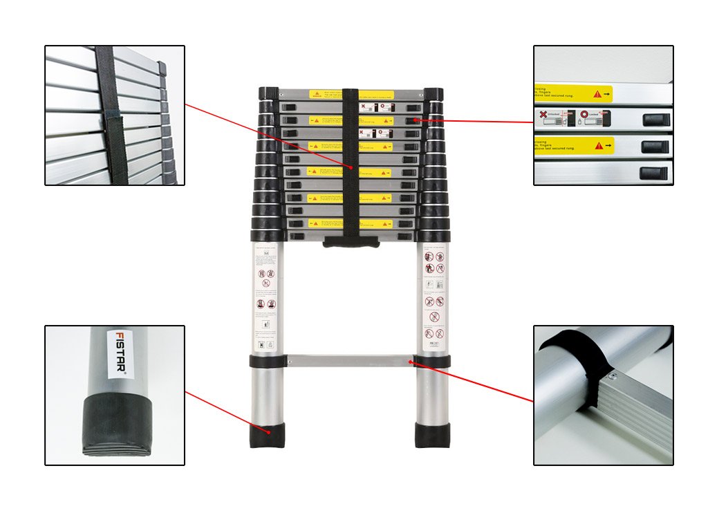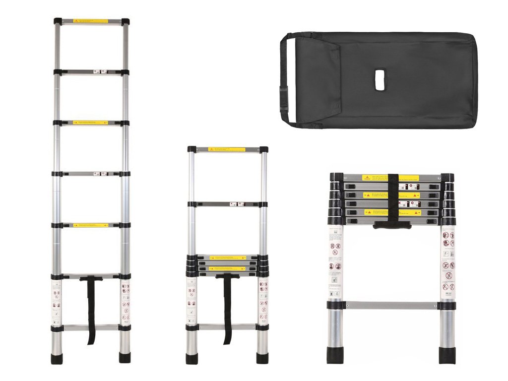 Az összecsukott teleszkópos létra egy szállítótáskában tárolható. Ez megkönnyíti a szállítást, tárolást és a pormentességet. Összehajtva könnyű, és könnyen elfér az autóban. Ugyanakkor nagyon tartós és biztonságos. Akár 150 kg-os terhelést is kibír.